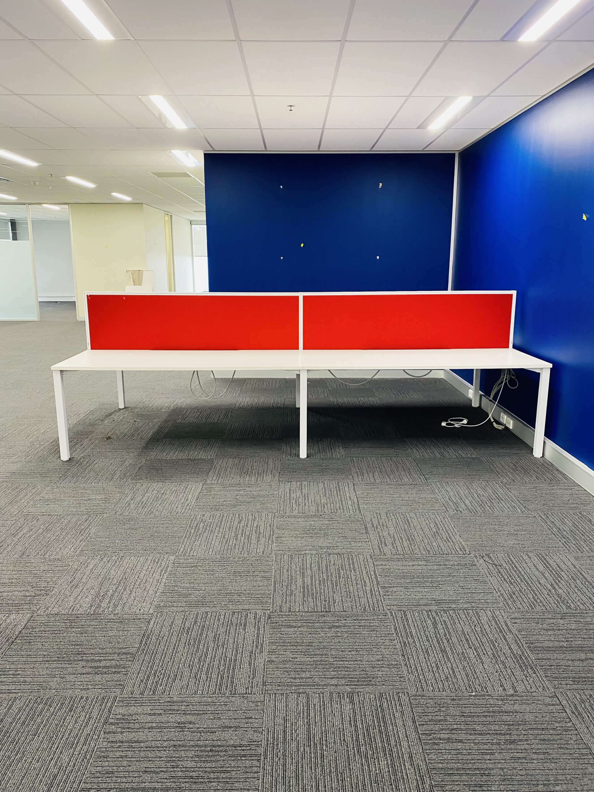 Integrated cable trays beneath each desk help keep wiring organised and out of sight, supporting a clean and clutter-free workspace. The bold red partitions add a contemporary touch, making this setup both functional and visually appealing.